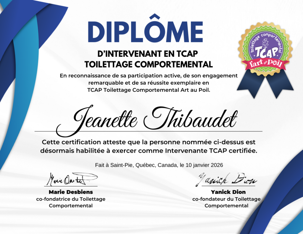 Pour l’accompagnement et le bien-être total de votre animal, je suis heureuse de vous annoncer que j’ai récemment obtenu mon diplôme TCAP (Toilettage Comportemental Art au Poil).